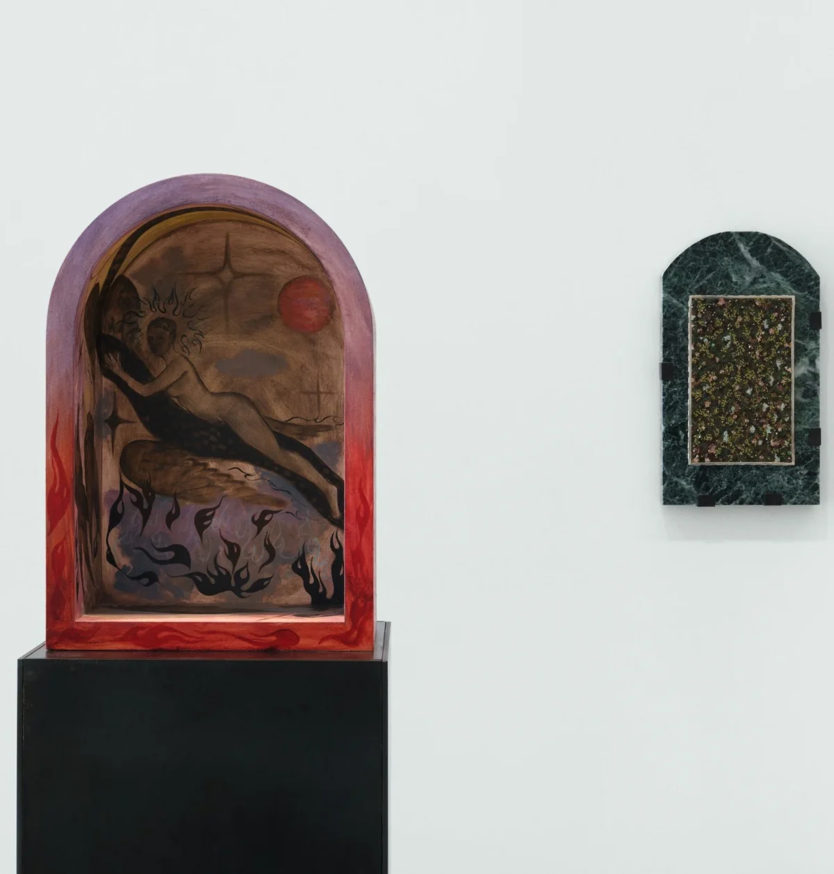 Artworks assume the form of altarpieces, reliquaries, icons, even constructs of a fictive universe, with materials of daily life—found trinkets, commercial items, bones, buttons— transformed into objects of transcendence.