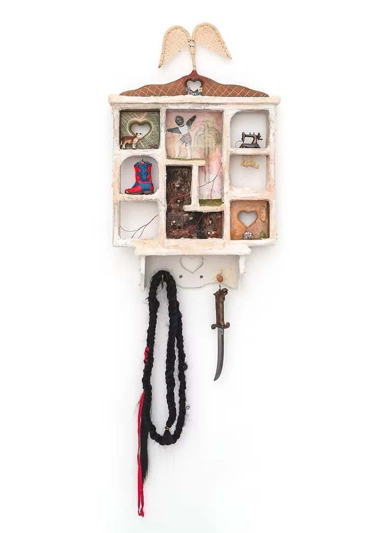 Artworks assume the form of altarpieces, reliquaries, icons, even constructs of a fictive universe, with materials of daily life—found trinkets, commercial items, bones, buttons— transformed into objects of transcendence.