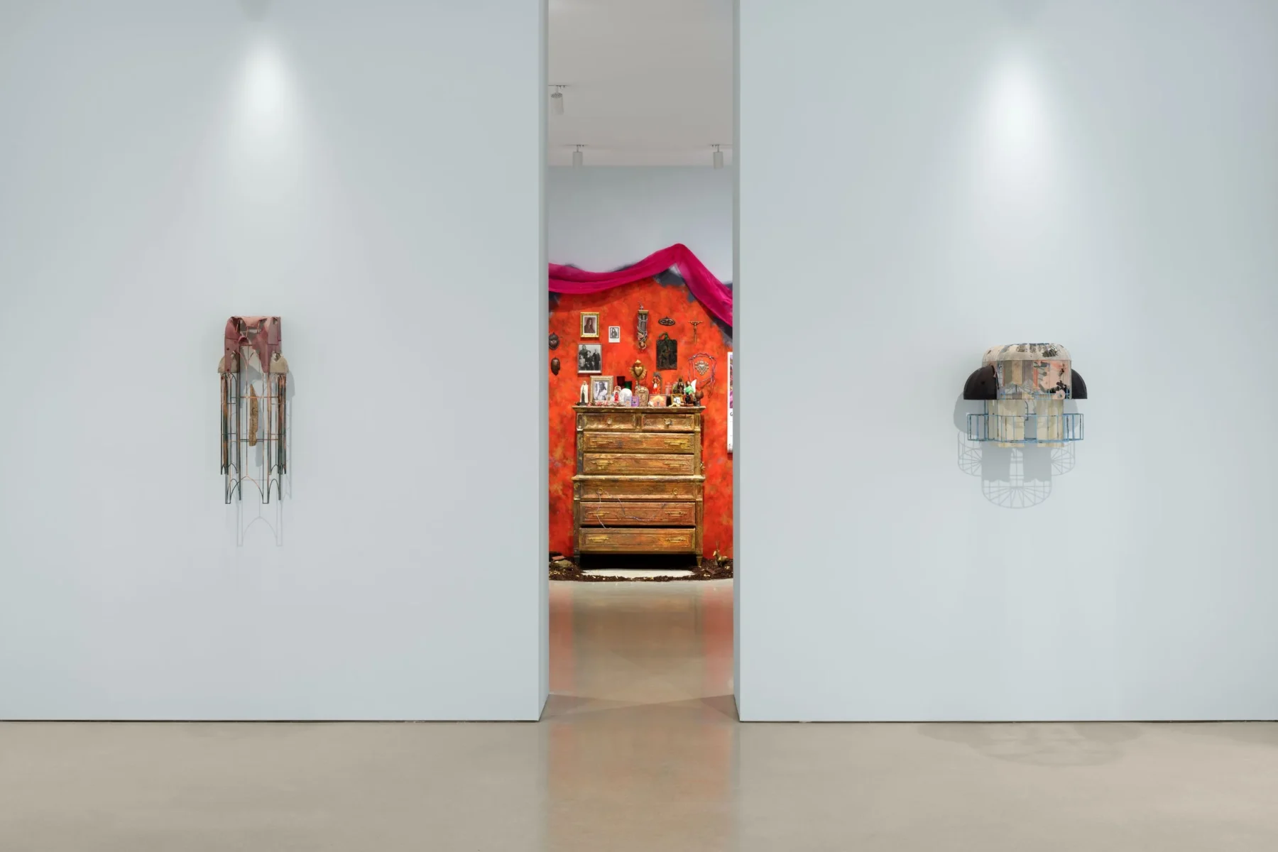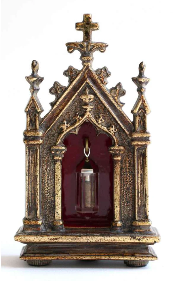 Amy Bravo’s A Curio uses the reliquary form, filling its recesses with objects tied to her Cuban-Italian heritage.