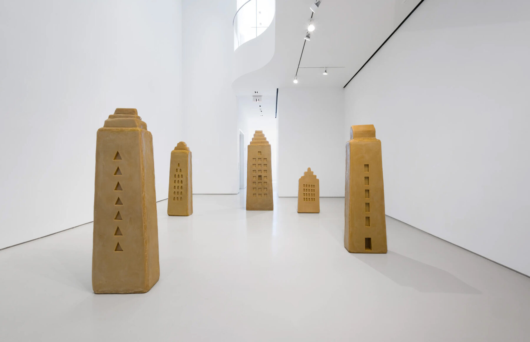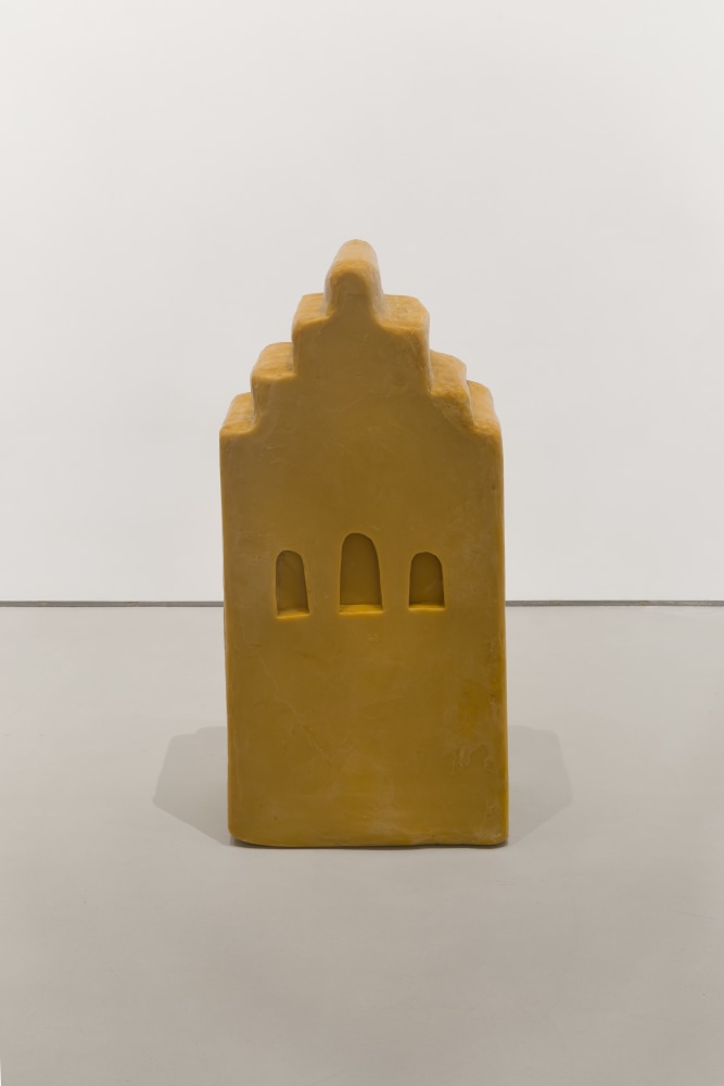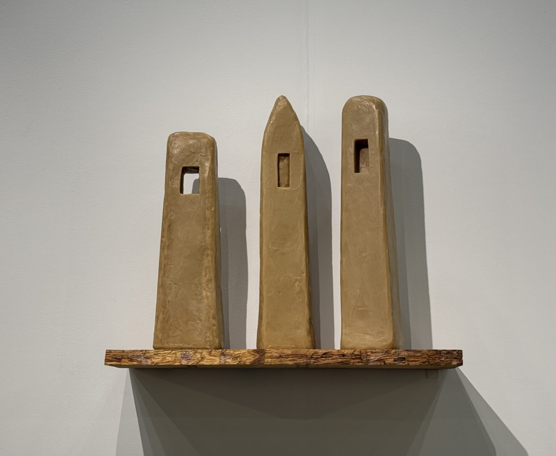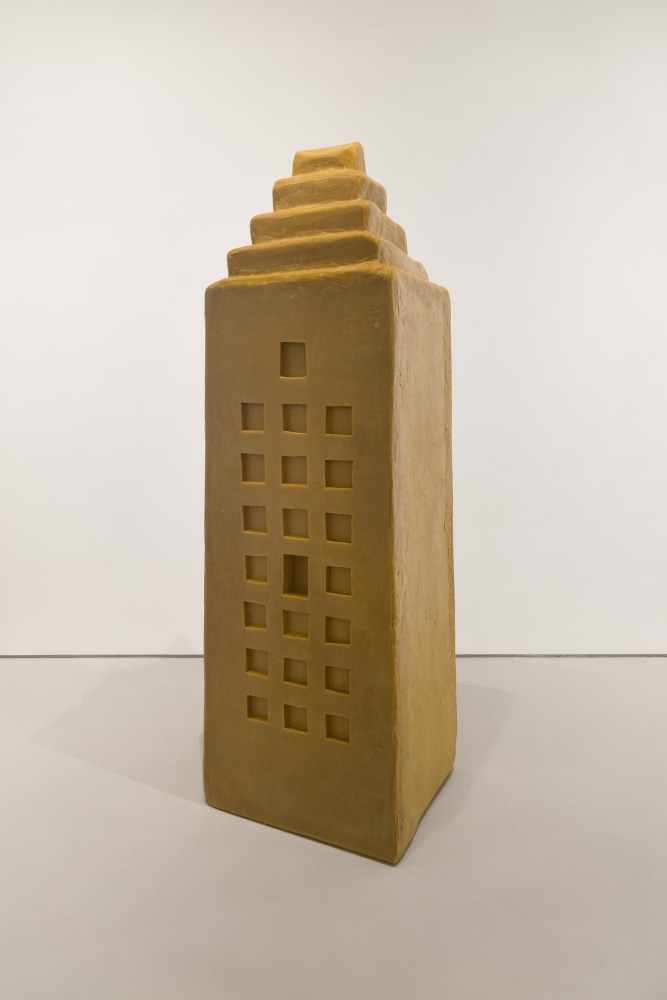 The exhibition was anchored by five monumental beeswax sculptures in the shape of houses, towers and ziggurats reminiscent of Mesopotamian religious step pyramids and Christian reliquary shrines. The beeswax sculptures have been described by poet and art critic Donald Kuspit as representing “the enlightenment, transcendence and selflessness the monk pursues through meditation–the inner solitude necessary for higher consciousness.”