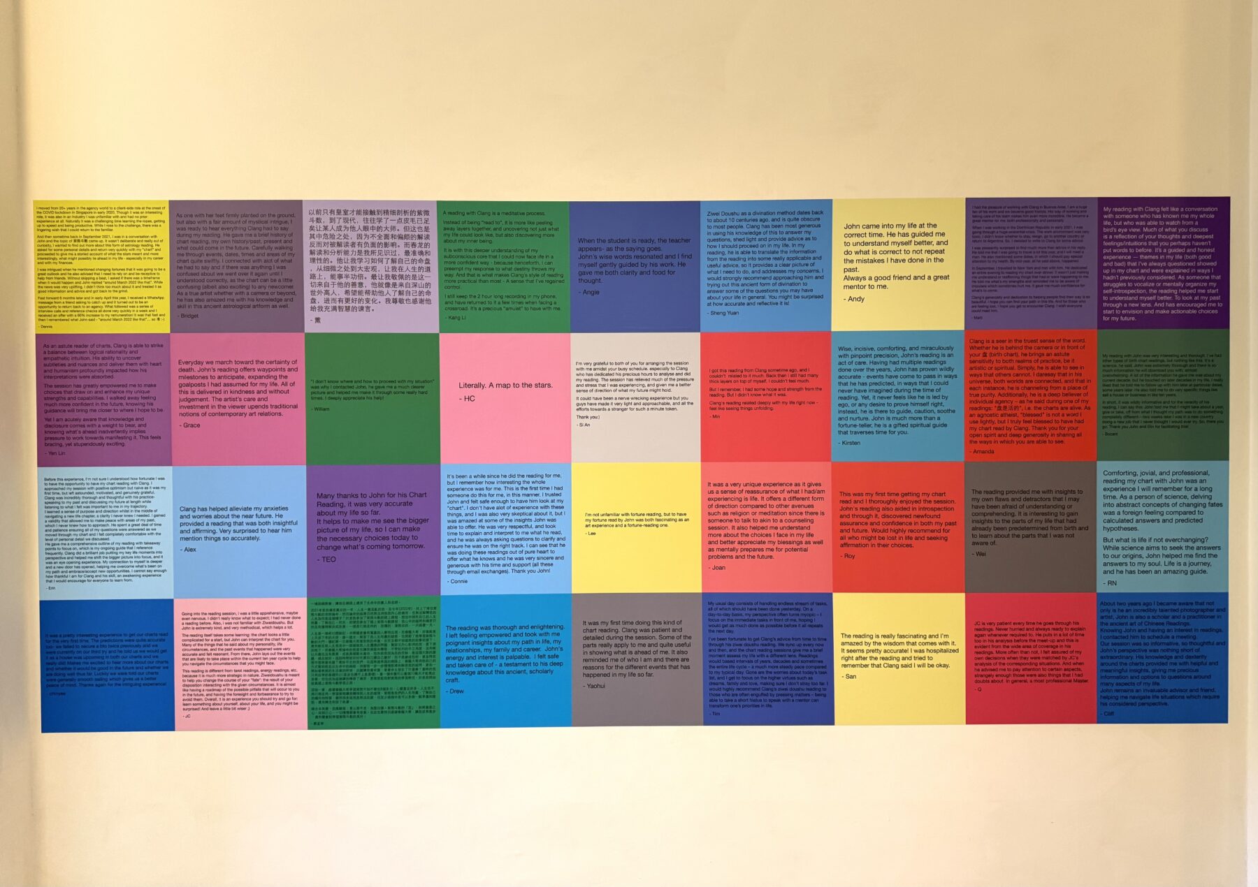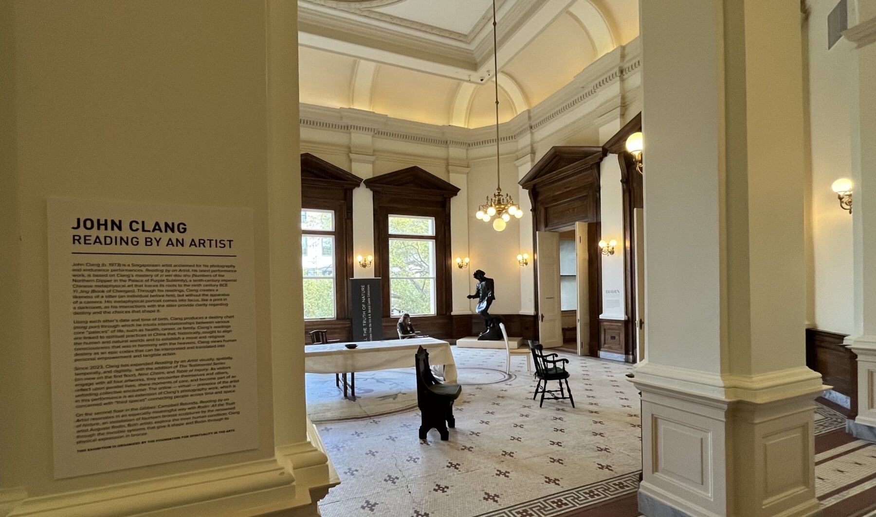 John Clang is currently performing his participatory artwork Reading by an Artist in the Cambell Rotunda at the Gibbes Museum of Art in Charleston, South Carolina. This work, based on traditional Chinese studies of the cosmos, results in a metaphysical portrait captured in long exposure — without the usual photographic apparatus of a camera and the end-product of a photograph. In each session, a “likeness” of the sitter, reminiscent of a print being developed in the darkroom, gradually comes into sharper focus as one obtains clarity about the intrinsic qualities in one’s life and the constellation of choices that shape them. Participants will interact with the Singapore-based artist virtually from the Gibbes Campbell Rotunda on Wednesdays through Saturdays, from 11am to 3pm.