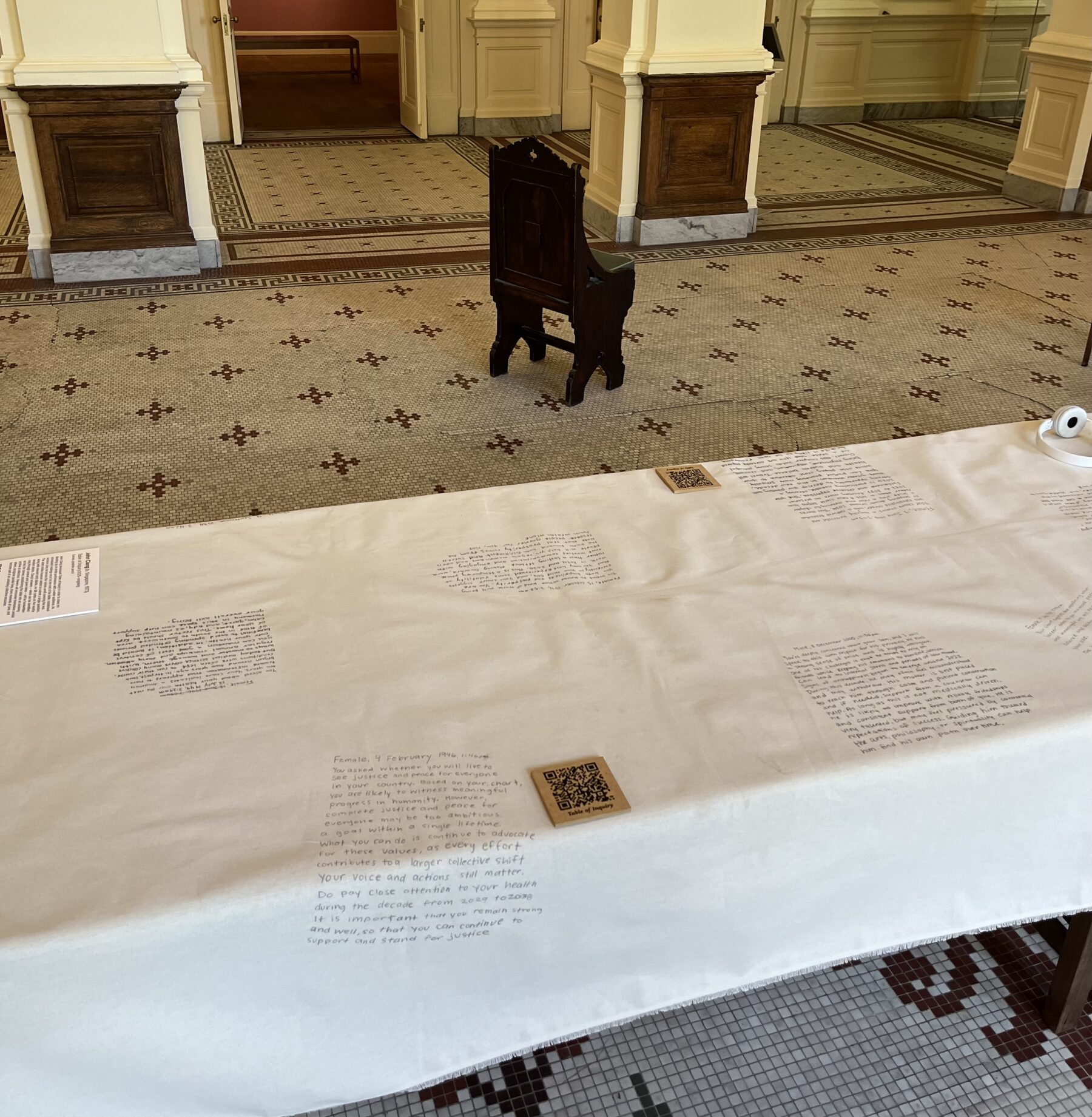 Reading by an Artist will be accompanied by three other works that extend Clang’s practice in generous ways: Table of Inquiry; Nine Chairs; and The Testimonial Series. Table of Inquiry invites viewers to submit single questions to the artist, and his answers will be written on a canvas scroll in the Gibbes Rotunda. To submit your question, click HERE.