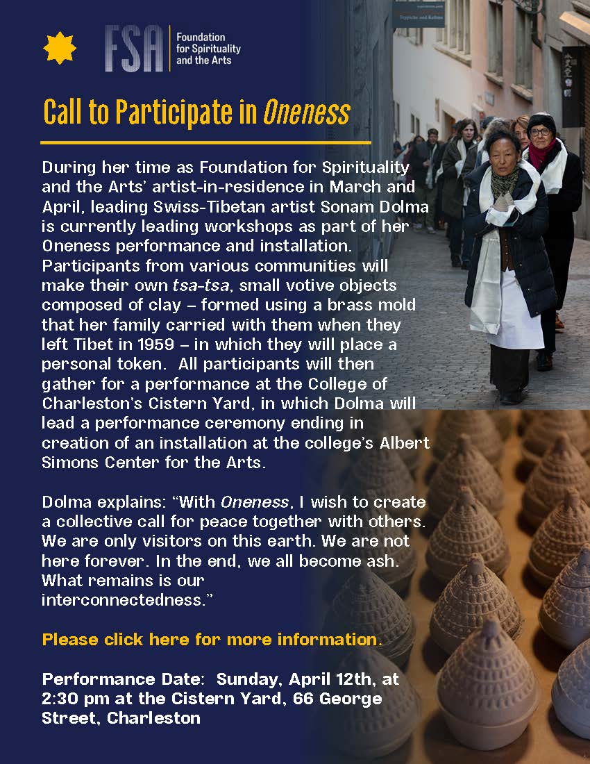 During her time as Foundation for Spirituality and the Arts’ artist-in-residence in March and April, leading Swiss-Tibetan artist Sonam Dolma is currently leading workshops as part of her Oneness performance and installation. Participants from various communities will make their own tsat-tsa, small votive objects composed of clay – formed using a brass mold that her family carried with them when they left Tibet in 1959 – in which they will place a personal token. All participants will then gather for a performance at the College of Charleston’s Cistern Yard, in which Dolma will lead a performance ceremony ending in creation of an installation at the college’s Albert Simons Center for the Arts.