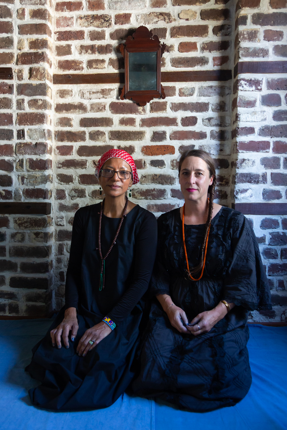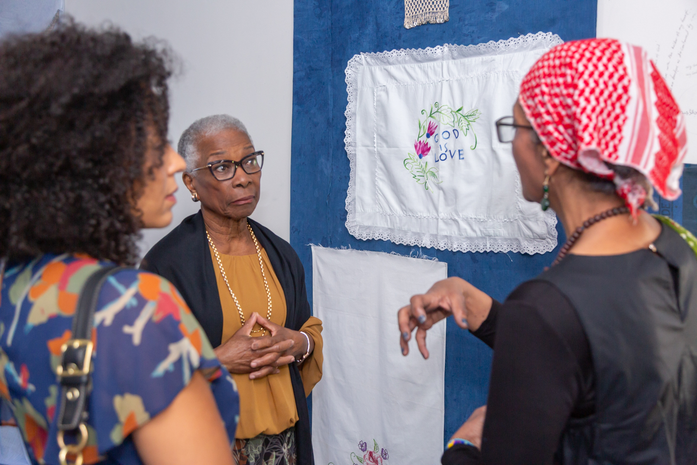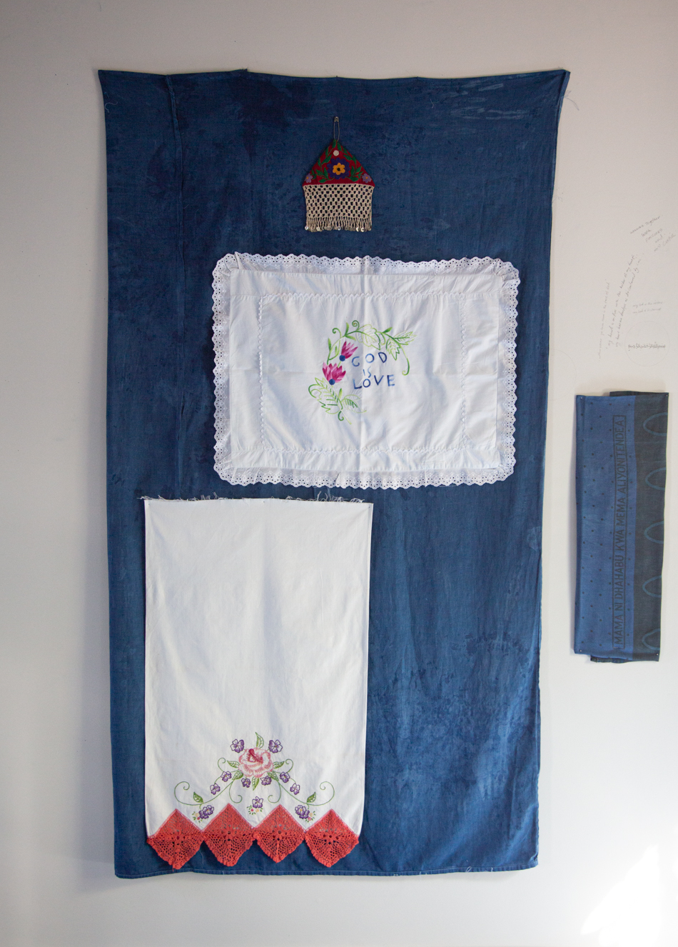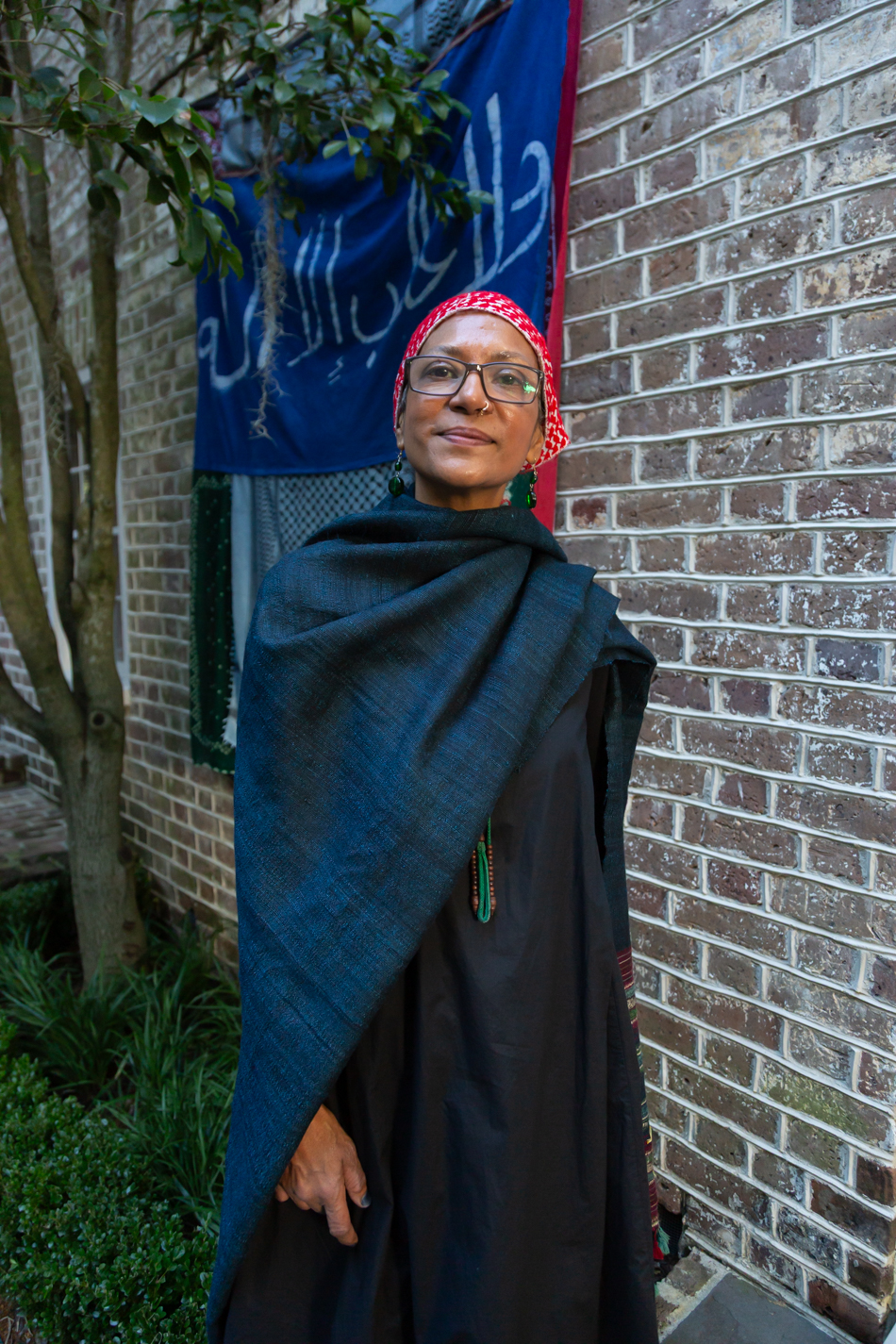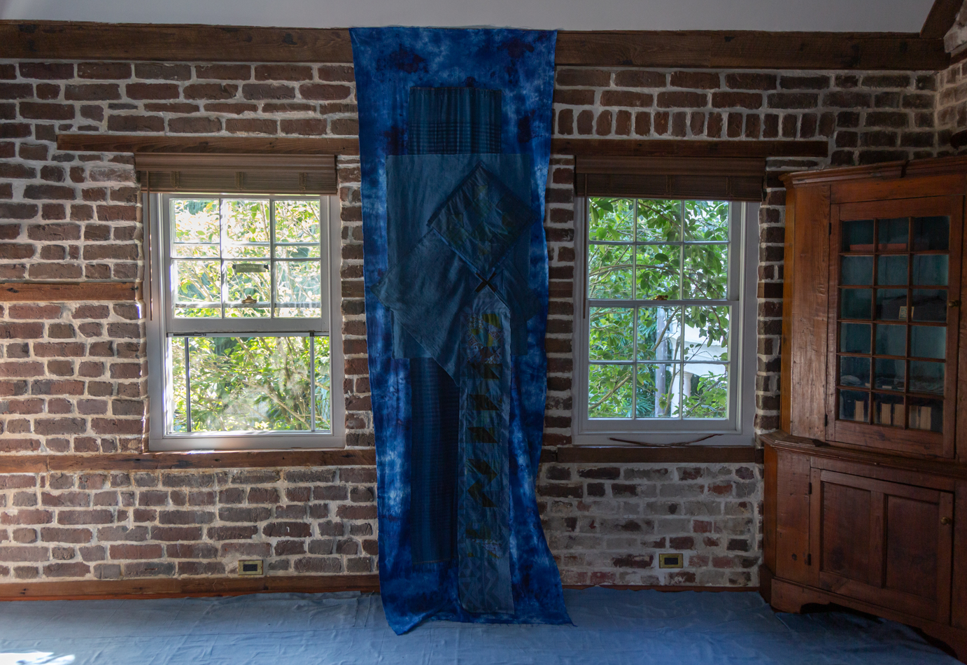 In Charleston, Ahmed collaborated with various individuals and local communities in order to engage with, share, and expand both her geometries and her explorations of textiles and natural dyes. Her past projects and current interests dovetailed with the work of several local indigo artists and cultivators and, shortly into her residency, she began a stunning collaboration with textile artist Precious Jennings. Both Ahmed and Jennings have personal collections of stitched and plain cloths, quilts, and embroideries from their respective mothers, grandmothers, and friends. As they harvested indigo plants at nearby farms and processed indigo dye, they cut, colored, refashioned, and repurposed these textiles into hangings, floorcoverings, and installations that spoke to a deeply spiritual act of communal making. Together, the artists conducted teaching workshops with schoolchildren on St. Helena Island and with young members of the Muslim community in Charleston. Local Muslim women assisted Ahmed with the Arabic lettering for a large banner, which she dyed with the noted artist Arianne King Comer. The Charleston residency provided Ahmed with another meaningful anchor in her lifelong exploration of plants, colors, pigments, and textile traditions that link disparate spaces, speak to diverse ancestries, and document histories of migration.